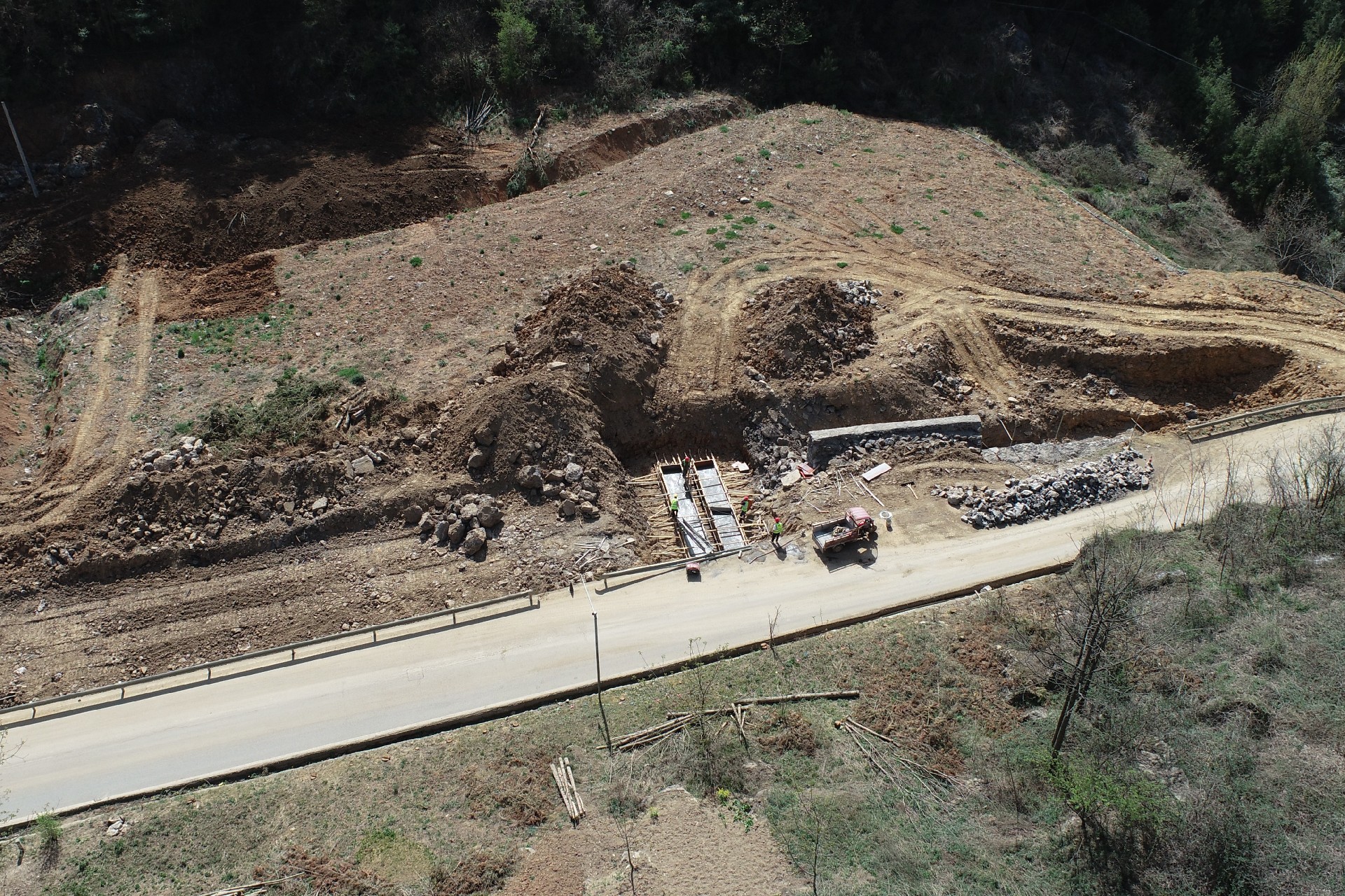 目前正在进行主线路基开挖,完成盖板涵预制85块,占总数52%;挡防工程5023方,占总数31%;土石方开挖6.5万方,占总数12%,利用土石方1.5万方,占总数11.5%;场镇段400米右幅底层6cm油面铺设。