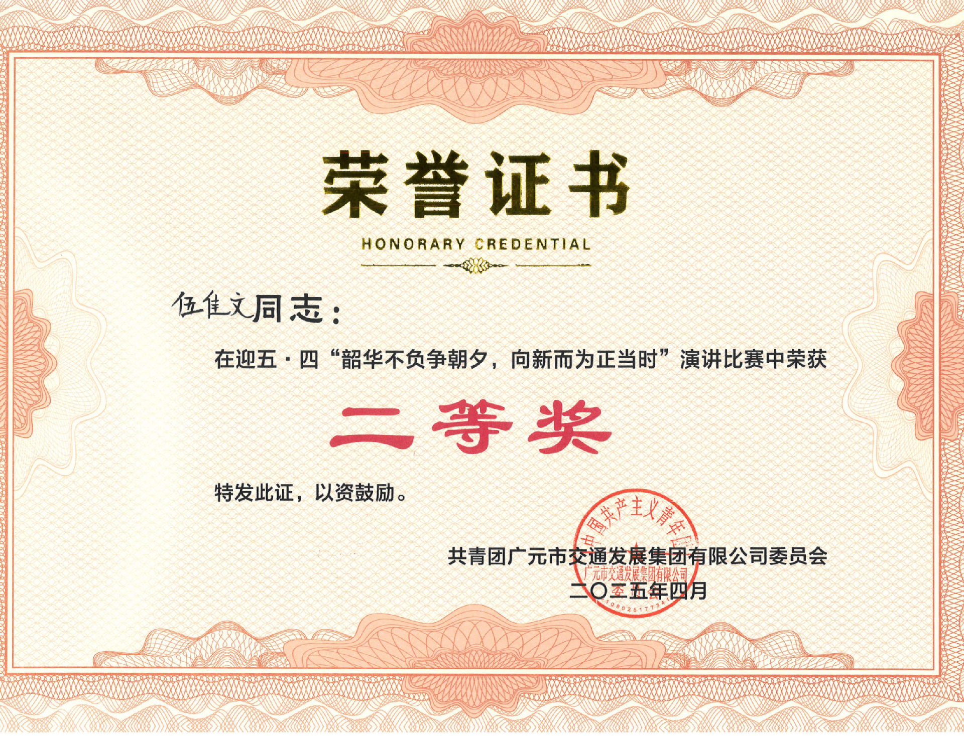 凭借极具感染力的舞台表现和真挚动人的内容表达,伍佳文同志从众多选手中脱颖而出,荣获二等奖佳绩。